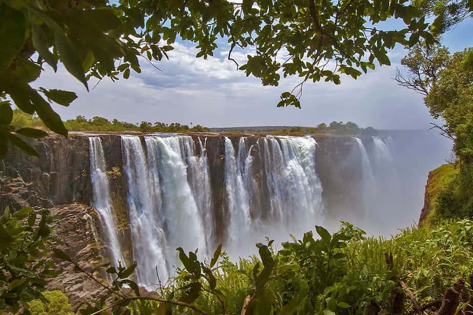 Het is een indrukwekkend gezicht. Een immense massa water die over de rand valt, een bewegend gordijn van water. En daarna op sommige plekken zo’n 60 meter, maar op het hoogste punt bij 108 meter naar beneden stort. En dat voor 1.708 meter lang. De herrie is honderden meters verderop hoorbaar. Wolken mist zorgen voor diverse regenbogen als de zon schijnt. Deze mist is gedurende het regenseizoen op 20 kilometer afstand nog te zien. Op sommige plekken regent het zelfs, zo dicht bij kan je komen. Dit is de beroemde Zambezi-rivier, een van de machtigste rivieren in Afrika.
