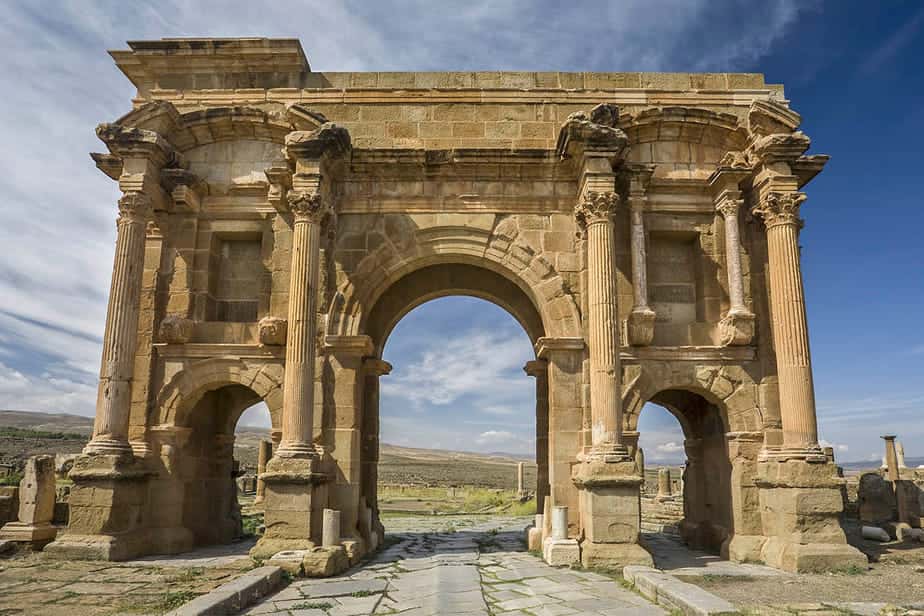 Timgad ligt op de noordelijke hellingen van het Aurèsgebergte in Algerije. Het is een heerlijke plek om te dwalen in het rijke Romeinse verleden.