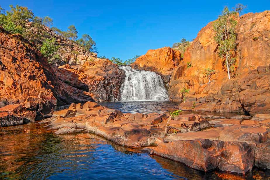De watervallen in Kakadu zijn landschappelijk fraai. Jim Jim Falls is de meest populaire. Je kunt naar het vallende water lopen. Jim Jim Falls is via een zandweg en een korte wandeling te bereiken.