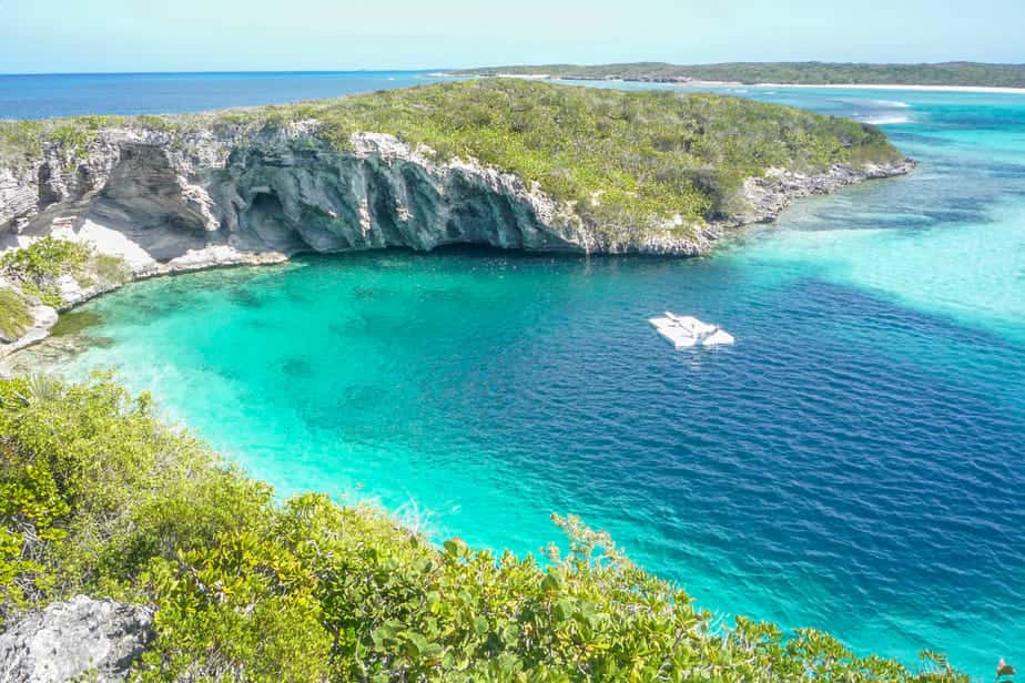 Dean’s Blue Hole ligt in een baai ten westen van Clarence Town op Long Island.