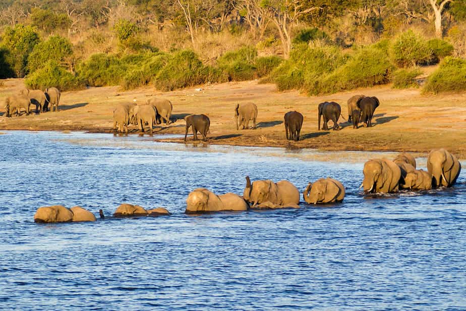 Een van de beste manieren om Chobe te beleven is per boot. Er worden hier geregeld olifanten gezien die de rivier oversteken, wat een bijzondere ervaring is. Sowieso zie je olifanten aan de kant van het water, als ze komen drinken. Soms bestaan de groepen olifanten wel uit honderd dieren.