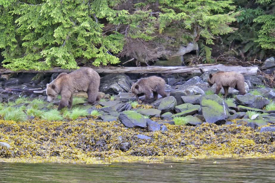 Grizzlyberen – ook wel bruine beren genoemd – leven verspreid over de regio, maar Knight Inlet biedt een unieke kans om ze van dichtbij in hun natuurlijke omgeving te observeren. Hier komen de dieren naar de oevers om voedsel te zoeken, vooral bij eb, wanneer schelpdieren en visresten achterblijven op het strand. Je ziet moeders met speelse jongen, solitaire mannetjes en beren die zich voorbereiden op de winter.