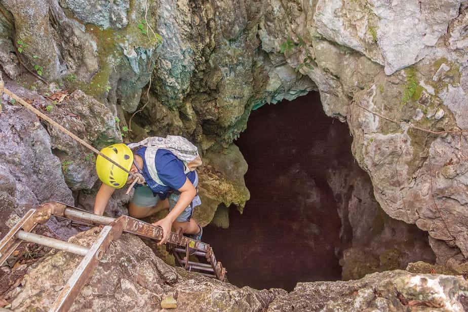 Je klimt via een ijzeren ladder op handen en voeten naar beneden, het gat is ongeveer 25 meter diep. Via een harnas zit je gezekerd aan een touw dat door een man wordt vastgehouden. Hij houdt je tegen als je valt. Althans dat is de hoop. Maar je valt normaal gesproken niet, want de ladder is steil maar wel goed te doen.