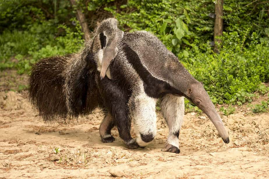 De reuzenmiereneter is maar liefst 2,5 meter lang. Hij zoekt overdag naar zijn favoriete maaltje: mieren en termieten. Met zijn scherpe klauwen scheurt hij de mierennesten open.