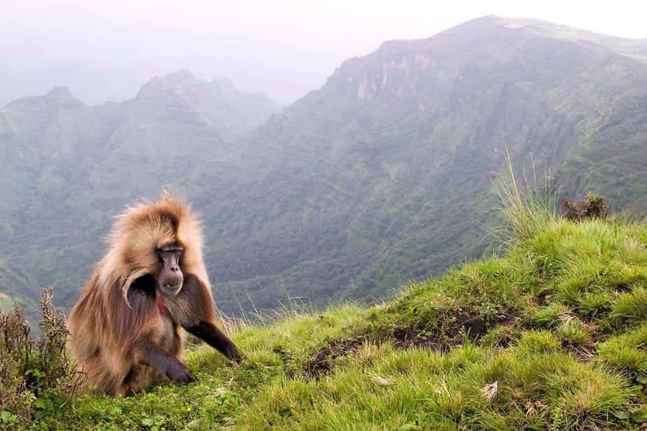 Hier leven, net als in grote delen van Afrika, ook apen. Maar de gelada eet gras. Het is daarmee de enige grasetende aap ter wereld. Die niet bang is voor mensen. Je kunt letterlijk midden in de groep van meestal meer dan honderd dieren gaan zitten. Het is een bijzonder gevoel.