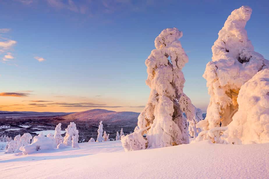 De foto’s hebben al talloze tijdschriften gehaald. Dennenbomen die doorbuigen onder de vele sneeuw, waardoor je de gehele boom niet meer ziet. Door de wind vriest de sneeuw vast aan de takken. En niet bij één, maar bij honderden. Dit is niet overal te zien, maar wel op diverse plekken. Vraag het de gidsen of je dit fenomeen via een wandeltocht of per sneeuwscooter kunt zien, want bijzonder is het wel.