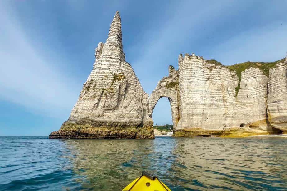 Als je over het strand loopt bij het dorp zie je vanzelf de kajaks liggen. Deze kun je per uur huren. Neem ruim de tijd, het is mooier dan je verwacht. En je maakt al snel enkele stops onderweg. De meeste bezoekers volgen de kust, de eerste natuurlijke boog is al zichtbaar. Deze heet Falaise d'Aval en is wereldberoemd uit films en televisieseries.