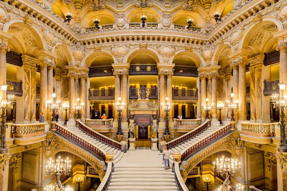 Het interieur is rijkelijk voorzien van bladgoud, fresco’s en marmer. Het gebouw komt uit 1875 en is ontworpen door Charles Garnier. Het kleurrijke plafond is pas in 1964 beschilderd door Marc Chagall. Het is onder meer bekend van The Phantom of the Opera. Tegenwoordig worden er vooral balletvoorstellingen gehouden.
