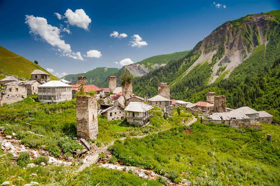 Hier leven de Svan, een etnische minderheid in Georgië. Het kenmerk van de dorpjes zijn de stenen torens uit de middeleeuwen. Dit zijn verdedigingstorens om het dorp te beschermen bij een aanval. Maar in de torens wonen ook mensen. Het zijn dus eigenlijk woontorens. Elk dorp heeft ze nog. Sommige kun je bezoeken, zodat je een fraai zicht op het dorp en de omgeving hebt.