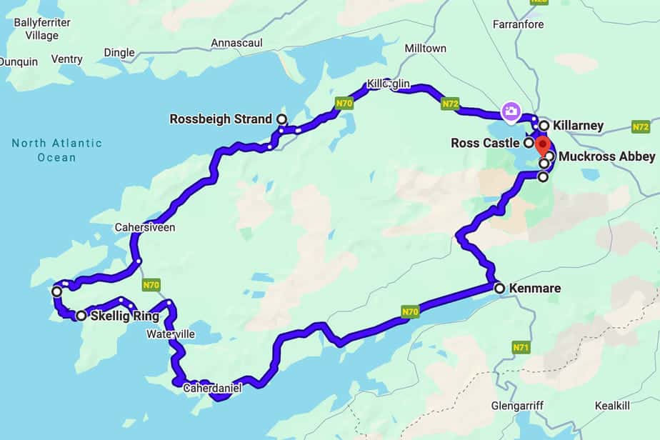 De meeste reizigers rijden de Ring of Kerry kloksgewijs, omdat je dan makkelijker kunt stoppen bij uitzichtpunten aan zee en minder last hebt van tourbussen, die vaak de andere richting nemen.