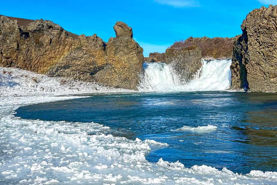 Tegenwoordig is alles anders. De waterval ligt langs de verharde weg. En is dus gemakkelijk te bereiken. Het waaide wel hard tijdens mijn bezoek in het voorjaar. Maar er lag nog wat sneeuw en delen waren bevroren. Het ijs maakte het nog mooier, soms dreef er een stuk voorbij. Er was verder niemand, ondanks het mooie weer met zon.