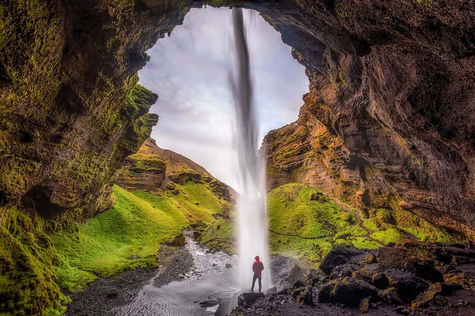 Kvernufoss is bijzonder omdat je achter de waterval kunt lopen. Zodat je een fraai beeld krijgt van het geweld. Hij lijkt daarmee op de bekende Seljalandsfoss. Hierdoor kun je fraaie foto’s maken van de rotsen en het water dat over de rand valt.