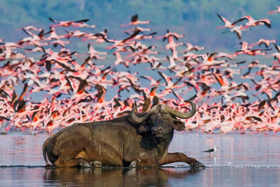 Lake Nakuru staat wereldwijd bekend om de grote groepen flamingo’s die langs de oevers van het meer foerageren. De aantallen variëren afhankelijk van het waterpeil en de beschikbaarheid van voedsel, maar op sommige dagen kleurt de oever volledig roze. Naast flamingo’s zie je hier ook pelikanen, ooievaars en visarenden.