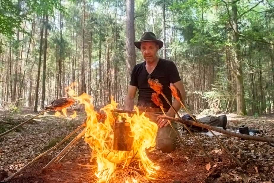 Martin geeft me oerspek, wat ik boven het vuur mag verwarmen. ,,We kunnen ook gaan vissen, dan kun je het echt zelf doen." Hij gaat zitten en geniet van de omgeving. Een paar vogels fluiten, een minuut later doet de theepot mee. Zo heb ik de natuur in Nederland nog niet beleefd.