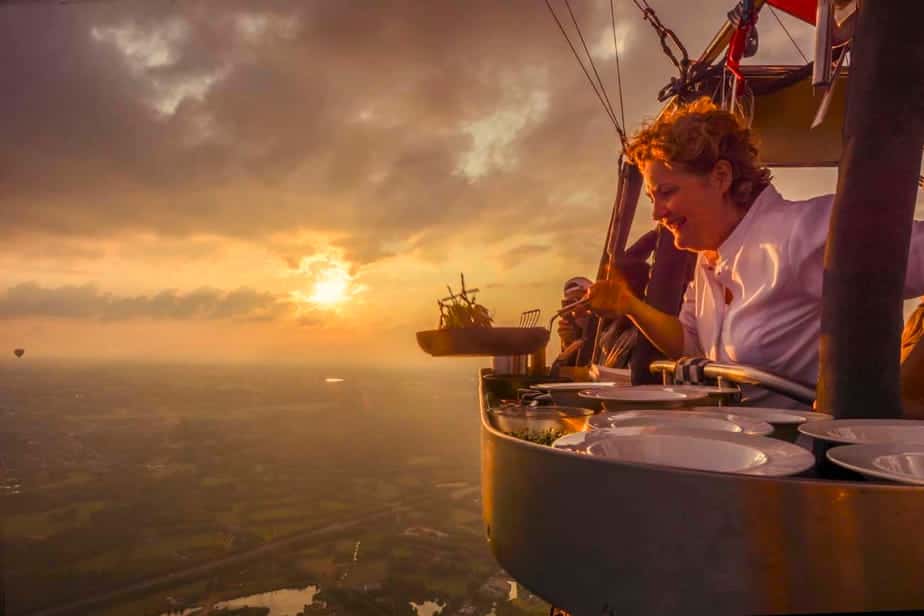 Al kan ik me er vooraf niet al te veel bij voorstellen: Dineren in een luchtballon. Ik heb al eerder in een luchtballon gezeten en weet hoe krap de ruimte in het mandje is. En om daar te eten lijkt me lastig, laat staan te koken. In een zeer korte tijd denk ik.