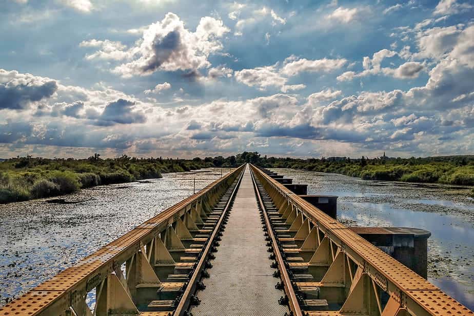 In 1888 werd begonnen met de bouw. Overstromingen en muggenplagen vertraagden de bouw. Maar vanaf 1890 reden er maar liefst vijf treinen per dag. Goederentreinen dus. Maar door de komst van de auto, en dus vrachtauto’s, werd de trein onrendabel. Een lokaal initiatief hield de bruggen langs de spoorlijn intact.