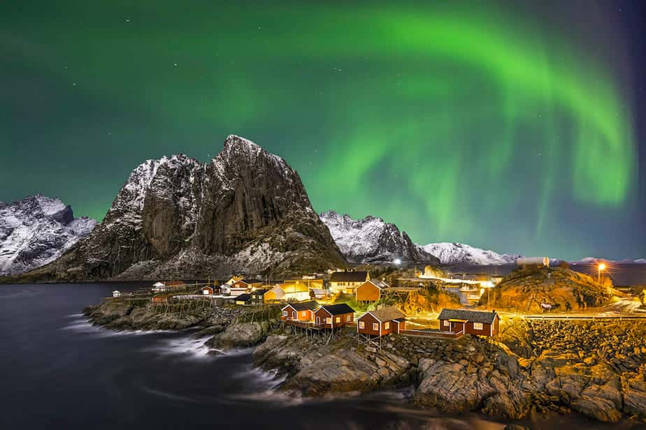De Lofoten behoren tot de mooiste eilanden op aarde. Ook hier geldt; de nabijheid van de zee, waardoor het hier redelijk vaak onbewolkt is. Maar er is een grote maar. De bergen van de Lofoten houden veel wolken tegen, waardoor het alsnog tegen kan vallen. De beste plek is het uiterste puntje, bij het stadje Å. Daar zijn de bergen minder hoog en heb je de meeste kans.