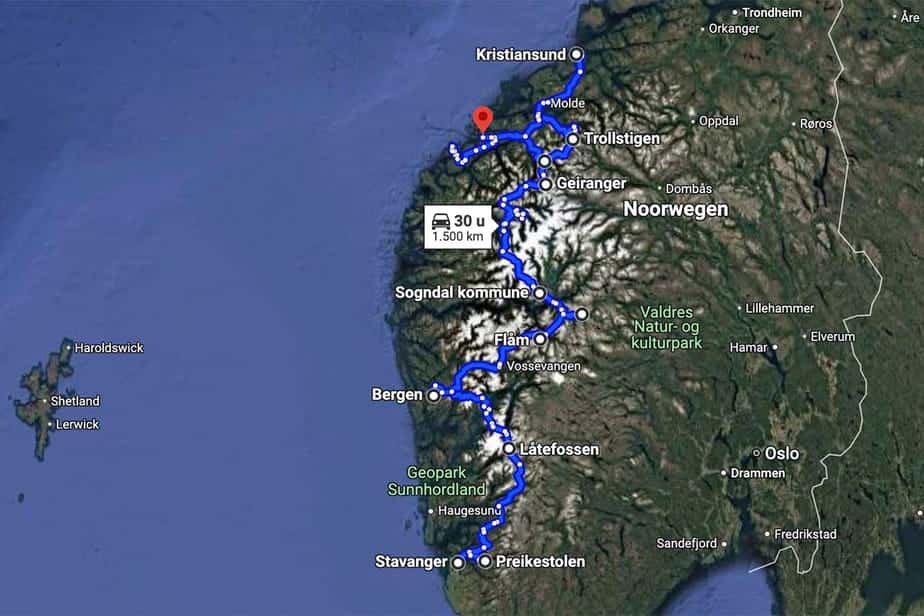 Als vertrekpunt is het gezellige stadje Stavanger aangehouden. Het is de dichtstbij liggende stad bij het zuidelijke deel van de Noorse fjorden. Het eindpunt is het veel noordelijker gelegen Ålesund. Ik heb hier bewust voor gekozen omdat dit deel van Noorwegen opvallend groot is. Als je met je eigen auto reist hoef je niet heen en weer te rijden. Daarnaast kun je eenvoudig vliegen op beide steden en dan deze tocht met een elektrische huurauto doen.