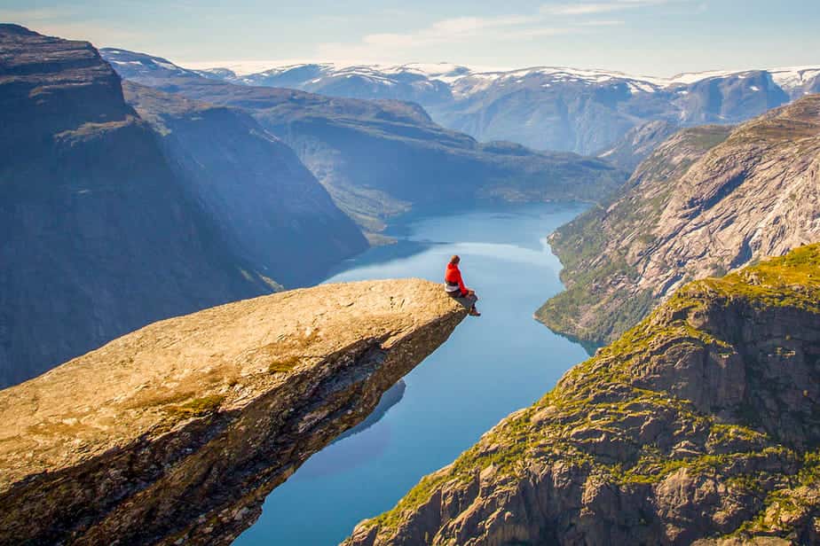 Trolltunga heeft een bijna magische uitstraling. Als je bij Trolltunga bent zul je zien dat de steen bijna horizontaal uit het gebergte steekt. Je kunt op de steen klimmen en zo over het randje kijken naar de Noorse fjorden onder je. Het is erg populair om een foto van een afstandje te maken met slechts één persoon op de tong.
