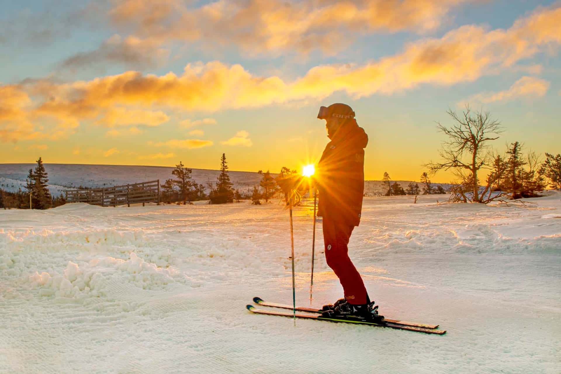 Na de lunch ga ik nog even lekker skiën in Kläppen. Meestal doe ik dat tot de liften sluiten. Of in dit geval tot het donker wordt. Maar, in Scandinavië heb je geen hoge bergen. Zodat je dus mijlenver kunt kijken. Waarbij je dus geregeld de zonsondergang kunt aanschouwen. En die is meer dan indrukwekkend merk ik.