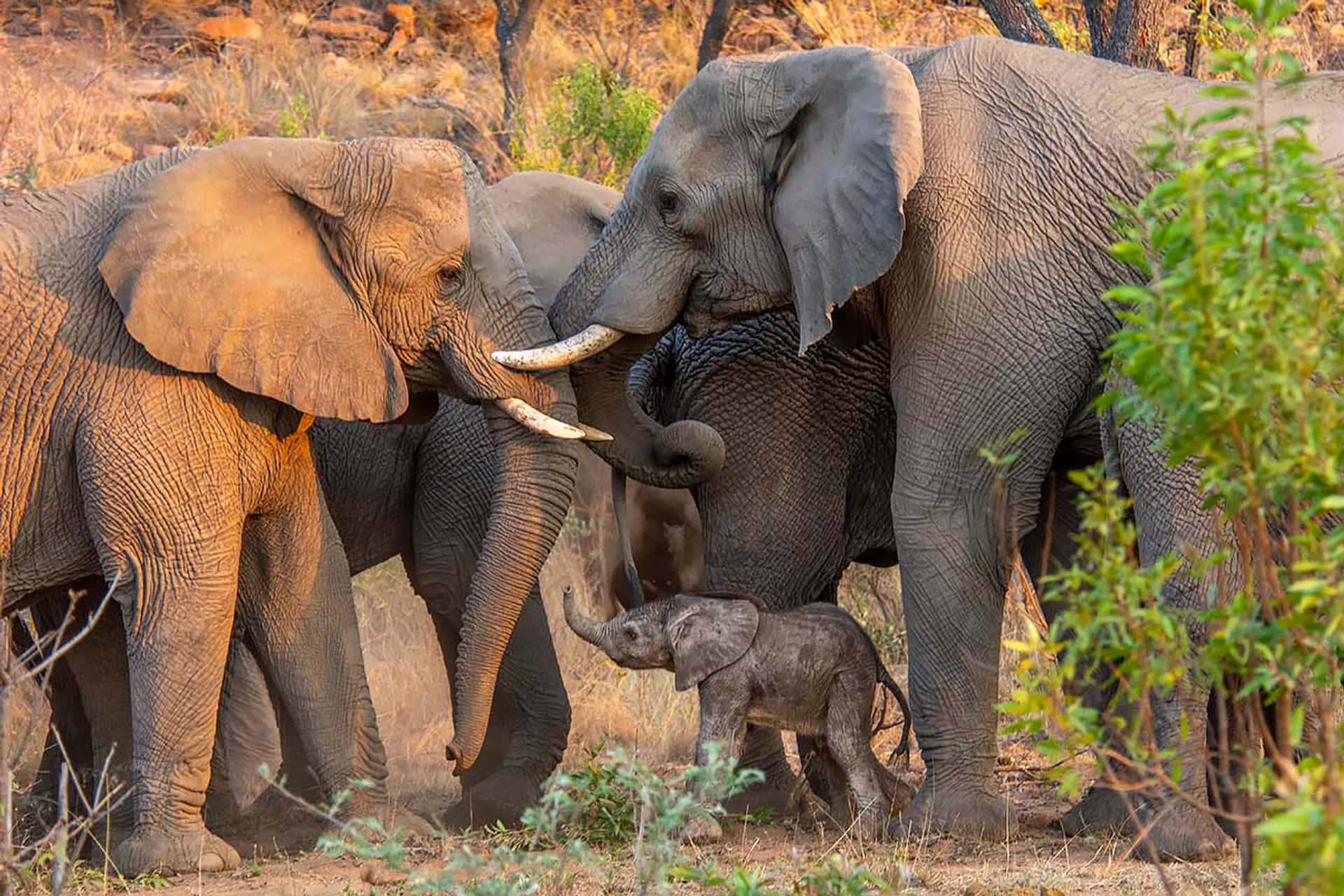Ik lees hem op mijn gemak door terwijl ik het zwembad in de gaten houd. Daar komen wekelijks wilde olifanten hun dorst lessen, ook overdag. De volgende ochtend hoor ik de olifanten, ze zijn in de buurt. Erg dichtbij zelfs. Na 5 minuten safari kom ik ze tegen. Afgelopen nacht is er een jong olifantje geboren, het kan nauwelijks op zijn poten staan. De groep blijft bij hem, totdat hij zelfstandig kan lopen. Alhoewel, het is eerder waggelen. De moeder is onrustig en ontfermt zich over haar kroost. Het is alsof ik in een natuurdocumentaire zit.
