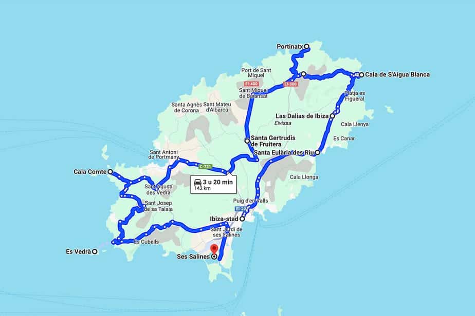 Afstand: Cala Comte naar uitkijkpunt Es Vedrà (20 km, 31 min), van Es Vedrà naar Ses Salines (23 km, 32 min), van Ses Salines naar Ibiza luchthaven (7 km, 10 min)
