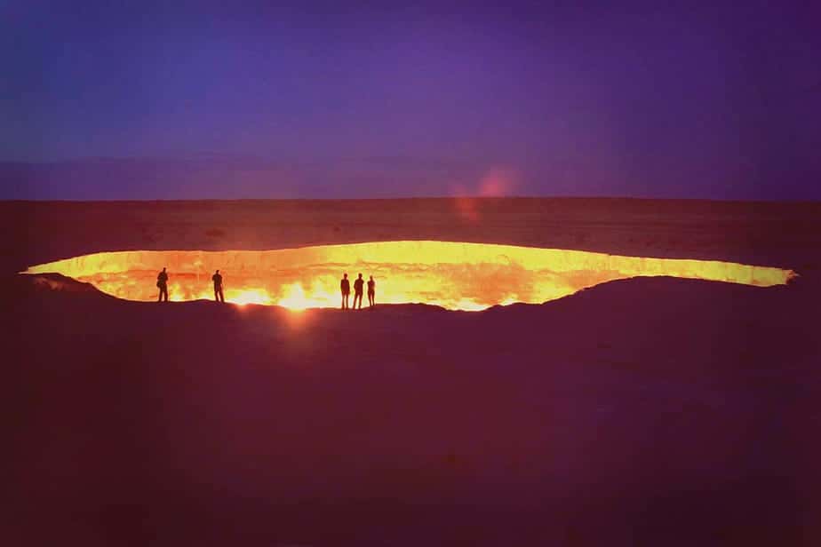 Toeristen komen van heinde en verre om dit wonderlijke schouwspel te zien. Wat velen niet weten is dat het door de mens is ontstaan. In 1971 deden geologen hier intensief onderzoek. Ze ontdekten een immense grot vol met methaan. Tijdens het boren voor het onderzoek stortte een deel van de grot in. Een krater bleef achter. En dat is het deel wat nu nog te zien is als je dit gebied bezoekt.