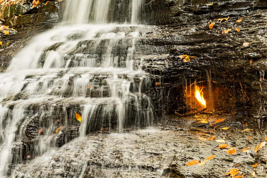 Eternal Flame Falls, de naam is prachtig. En het zegt wat het is: Een vlam in een waterval. Het bestaat echt, in de Verenigde Staten. Wetenschappers hebben lang gezocht naar een verklaring waarom in de waterval gas vrij komt. Het blijkt vooral methaan te zijn, die uit de grond omhoog komt. Dit is makkelijk ontvlambaar, vandaar de vlam.