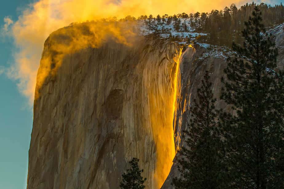 Horsetail Fall in Yosemite National Park behoort tot de meest bijzondere watervallen ter wereld. Elke februari (meestal aan het einde van de maand) valt de winterzon bij zonsondergang tussen de rotsen door op de waterval in de VS. En wordt hij goud. Deze waterval is dan ook beroemd bij fotografen en filmmakers door dit bijzondere fenomeen.