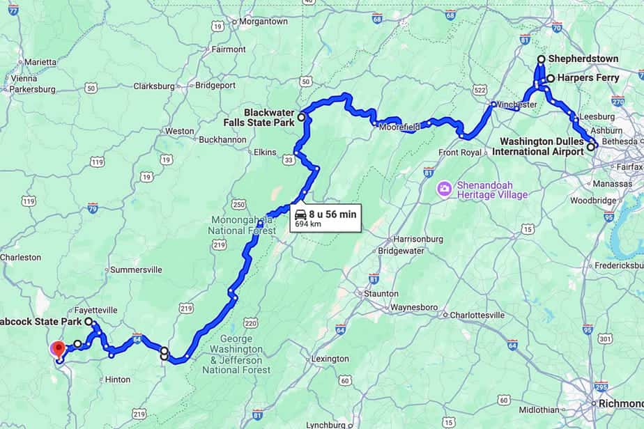 Als vertrekpunt voor de rondreis door West Virginia is de luchthaven van Washington DC (IAD) aangehouden. Al kun je ook goed de (kleinere) luchthavens van Raleigh County Memorial Airport (BKW) of Charleston Yeager Airport (CRW) aanhouden bijvoorbeeld. De start en het eindpunt liggen op de luchthaven, omdat veel reizigers hier hun huurauto ophalen na hun vlucht. Deze West Virginia Road Trip is goed te rijden in 7 dagen, zonder dat je te lang in de auto zit. In de natuurgebieden heb ik iets meer tijd genomen, zodat je ook wat kunt relaxen op deze reis. Het is in dit deel van Amerika logisch dat je veel meer uitstapjes kunt doen. De leukste heb ik ook vermeld in dit artikel.