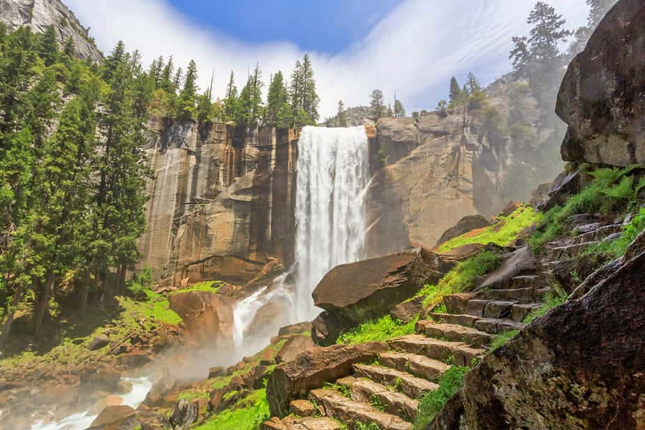 Bij Vernal Fall sta je aan de voet van de waterval, waarna het pad langs de loodrechte rotswand omhoog loopt naar de top van de waterval. Waarna je verder kunt naar Nevada Fall.