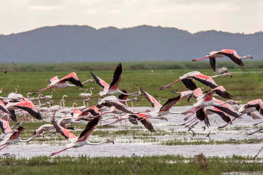In Lake St Lucia leven honderden flamingo’s. Het meer, dat ook bekend staat als Lake Sibaya, is op talloze plaatsen ondiep. Zodat hier watervogels op zoek kunnen gaan naar voedsel. Zoals visjes, of in het geval van de flamingo’s, kleine waterkreeftjes. Waardoor ze hun roze kleur krijgen. Daarom zie je bij jonge dieren de roze kleur niet. Deze zijn meestal nog grijs van kleur. Met hun poten schoppen de flamingo’s door de bodem, waarna ze de kreeftjes kunnen opeten. Dit doen ze meestal massaal, zoals je kunt zien.