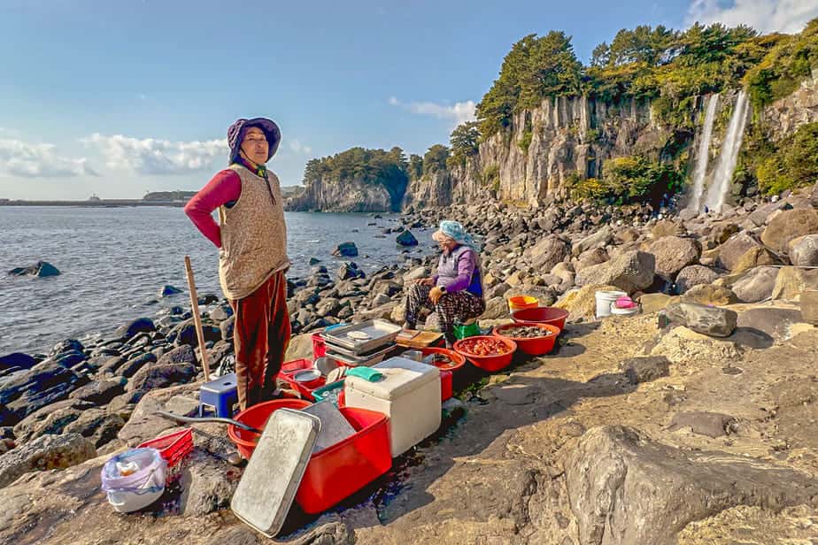 Aan de voet van Ilchulbong kun je aan de linkerkant de Haenyeo zien. De legendarische vrouwelijke duikers van Jeju geven hier dagelijks een show, maar verkopen ook hun verse vangst die je kunt proeven. Als je van zeevruchten houdt, is dit een unieke kans. En je zorgt ervoor dat een van de meest unieke beroepen op de planeet blijft bestaan.