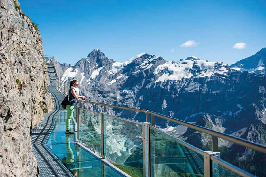 Dit wandelpad aan een bergwand is 200 meter lang. Het is gemaakt van staal en glas. En dat op 2.970 meter hoogte in het Berner Oberland. Je zou bijna de omgeving vergeten als je hier loopt, maar dat zou echt zonde zijn.