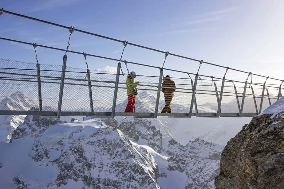 Wie hier gaat lopen steekt de Titlis-bergketen over, op ruim 3.000 meter hoogte. Je kijkt in een gat van maar liefst 500 meter. De brug is 106 meter lang en wie zich naar de overkant waagt heeft een mooi uitzicht over de Alpentoppen.